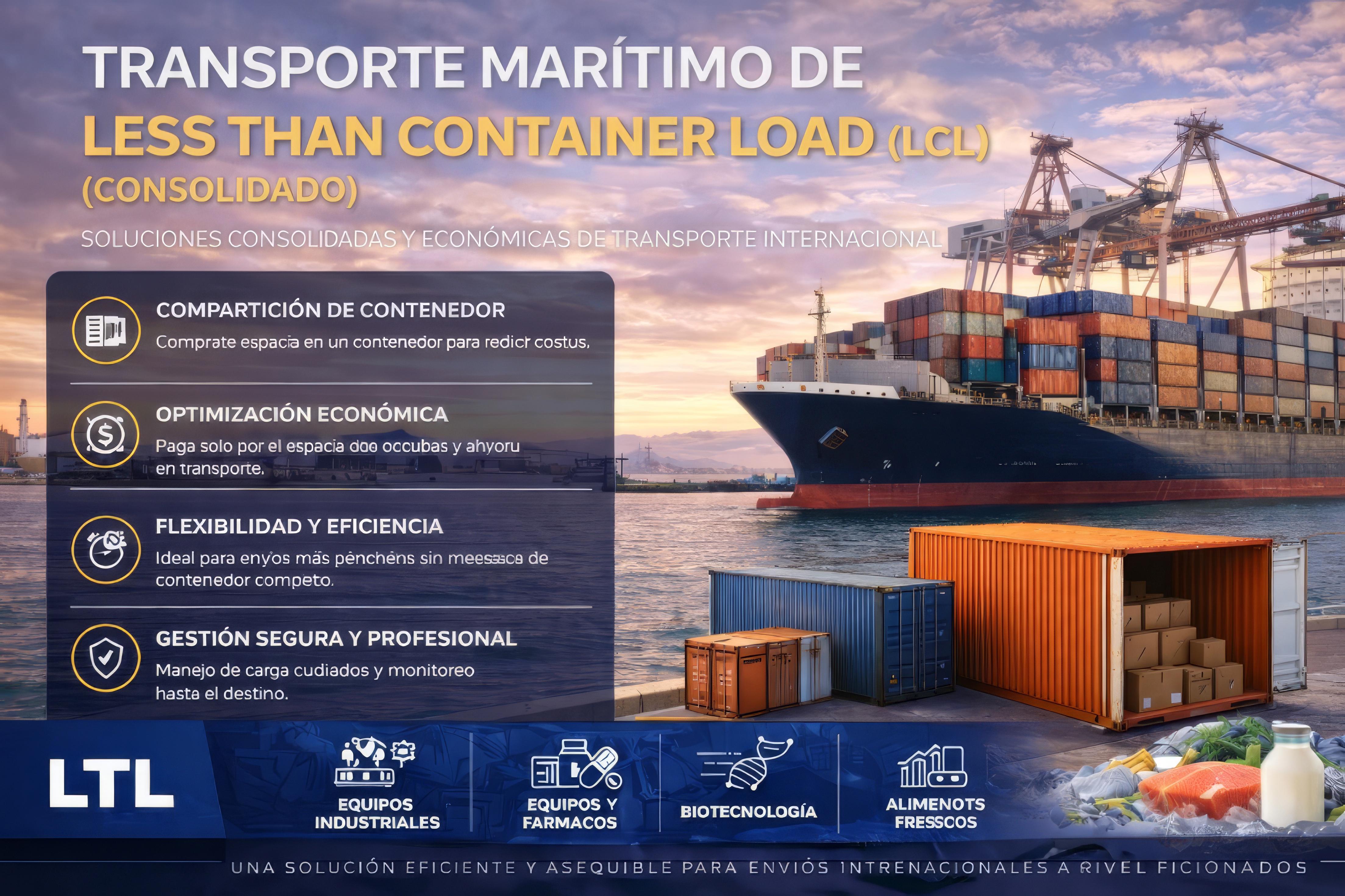 Estratégia de custos para remessas de menor porte. Otimizamos o espaço por meio da consolidação de mercadorias, oferecendo rotas diretas e frequências semanais para os mercados mais relevantes