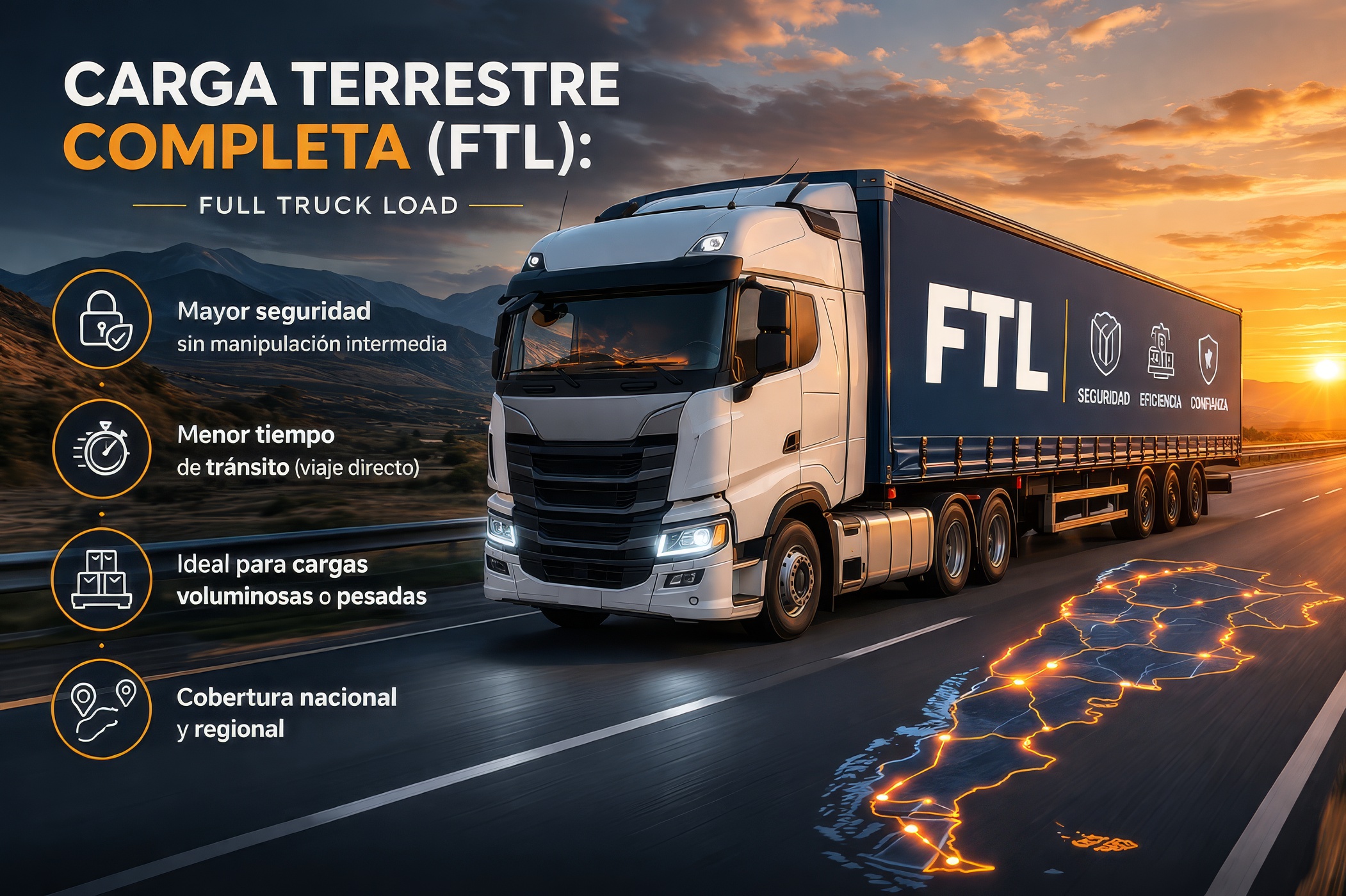 Ideal para grandes volúmenes de carga que requieren un camión exclusivo. Garantiza una mayor flexibilidad en los horarios de recogida y entrega, y una ruta directa entre el origen y el destino.